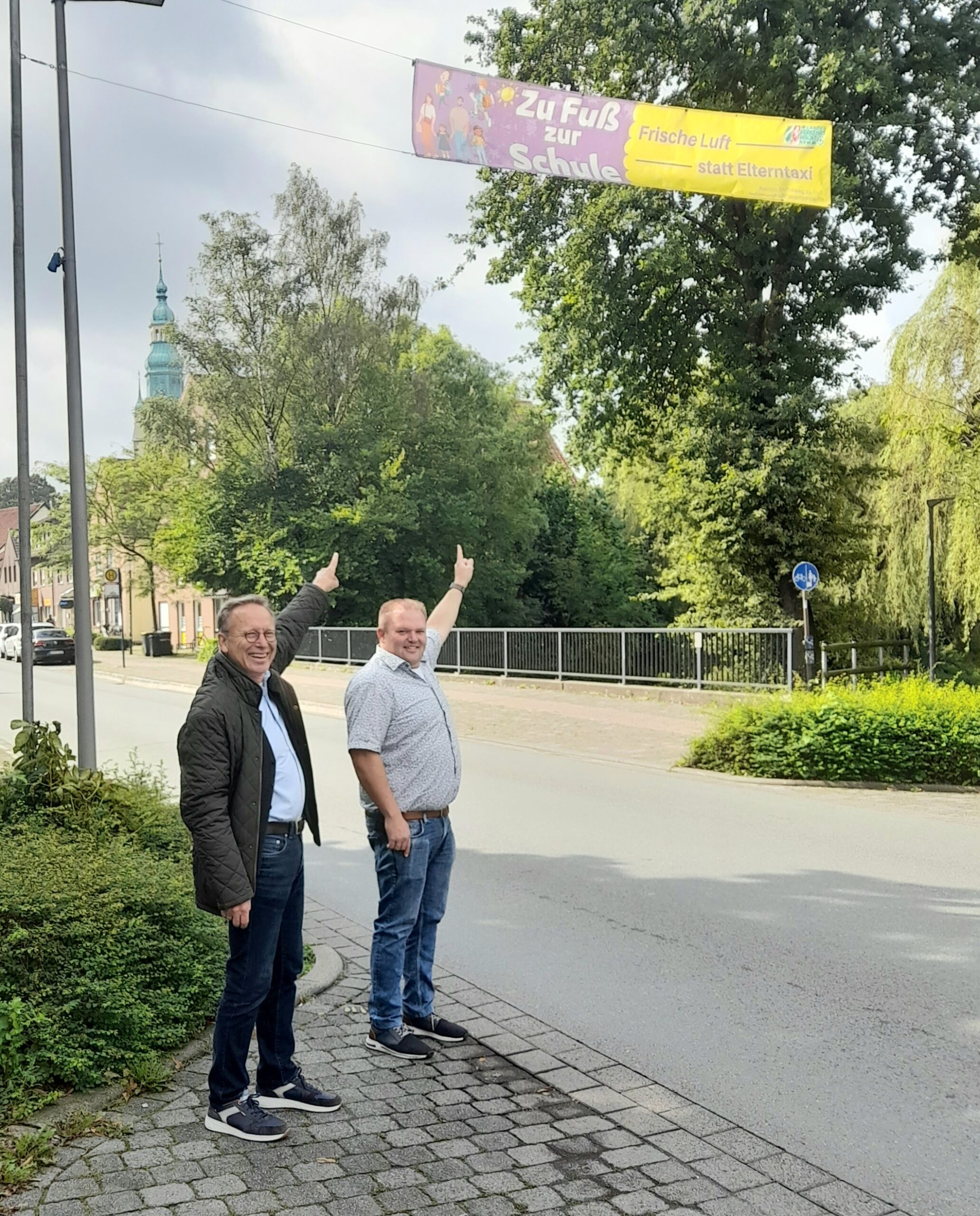 Banner mit der Aufschrift „Zu Fuß zur Schule – Frische Luft statt Elterntaxi“ oder „Ohne Auto zur Schule – Frische Luft statt Elterntaxi“ sind in diesen Tagen im Umfeld einiger Grundschulen aufgehängt. „Das ist ein Schritt, um die Anzahl der Autos vor den Schulen zu minimieren“, sagt Marcus Korte, Vorsitzender der Verkehrswacht.