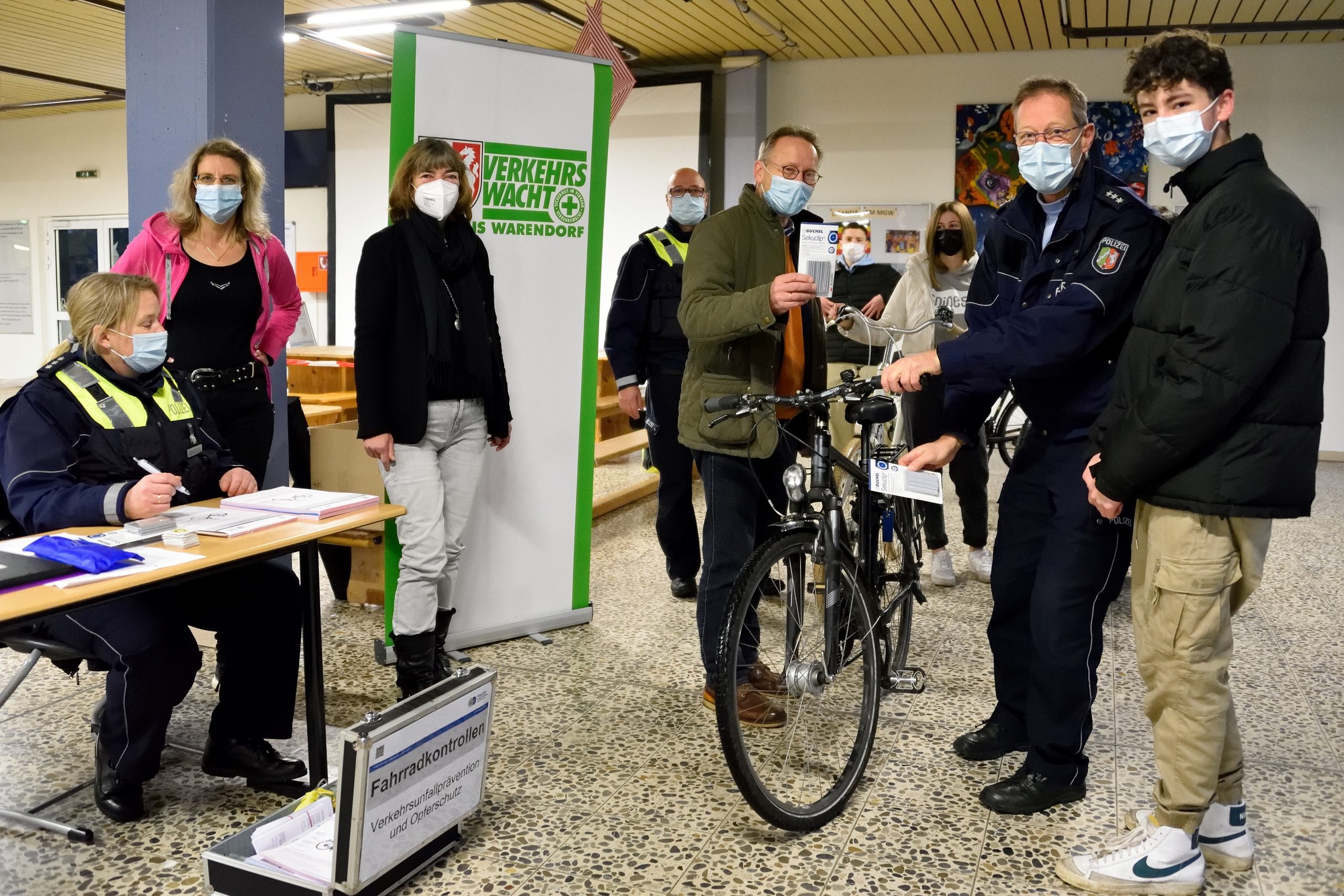 Gemeinsame Fahrradkontrolle in der Aula des Mariengymnasiums Warendorf - v.l.n.r.: Hauptkommissarin Carola Krewerth, Koordinatorin Petra Recker, Schulleiterin Uta Schmitz-Molkewehrum, Geschäftsführer Verkehrswacht Werner Schweck, Hauptkommissar Theo Pier, Achtklässler Mika Hödt; im Hintergrund: Hauptkommissar Richard Rauer