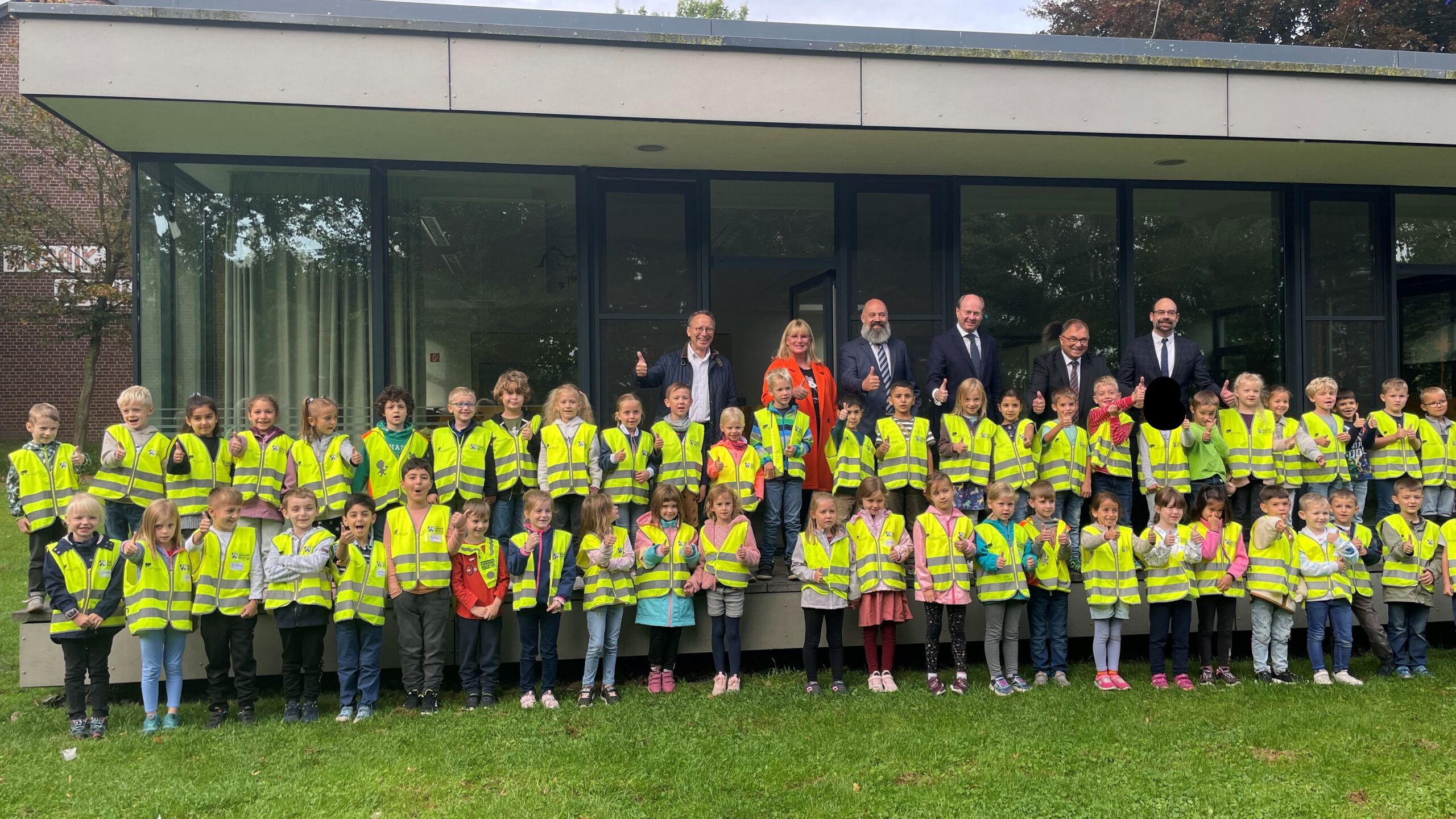„Gerade unseren jüngsten Verkehrsteilnehmer fehlt im Straßenverkehr in der Regel noch die Übersicht und die Fähigkeit, Gefahren richtig einzuschätzen. Daher ist es wichtig, dass sie von den anderen Verkehrsteilnehmern rechtzeitig gesehen werden. Das gilt besonders, wenn es nun über Herbst und Winter dunkler und regnerischer wird“, unterstreicht Landrat Dr. Olaf Gericke als Schirmherr der Verkehrswacht bei einer Vorstellung der Westen an der Mosaikschule in Ennigerloh.