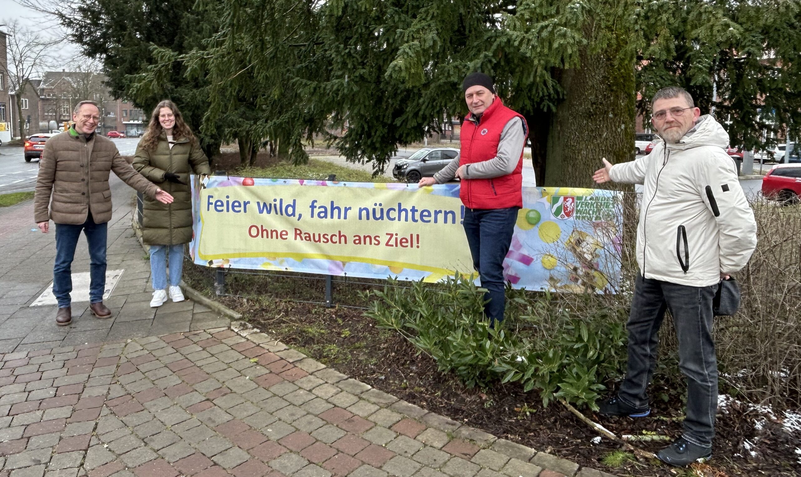 „Alkohol am Steuer ist eine Gefahr für alle. Und auch am Morgen danach ist Vorsicht geboten: Wer viel trinkt, hat auch Stunden später noch Restalkohol im Blut“, warnen Werner Schweck, Geschäftsführer der Verkehrswacht, und Carolin Neuhaus, Mobilitätsmanagerin der Kreisverwaltung Warendorf. Beide hängten dazu gemeinsam mit Frank Buntrock, Stabsstelle Klimaschutz und Mobilität, sowie Michael Göttfert, Ordnungsamtsleiter der Stadt Ahlen, ein Banner mit der Aufschrift „Feier wild, fahr nüchtern!“ an einer zentralen Stelle im Stadtgebiet Ahlen auf.